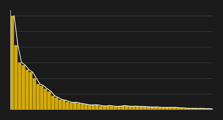 하지만 소득이나 자산은 다릅니다. 이는 '멱법칙(Power Law)'을 따르는 데이터로, 오른쪽으로 긴 꼬리를 가진 비대칭 분포를 보입니다. 하한선(0원)은 막혀 있지만 상한선(수천억 원)은 뚫려 있기 때문입니다.