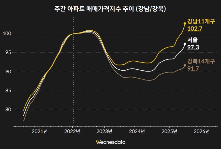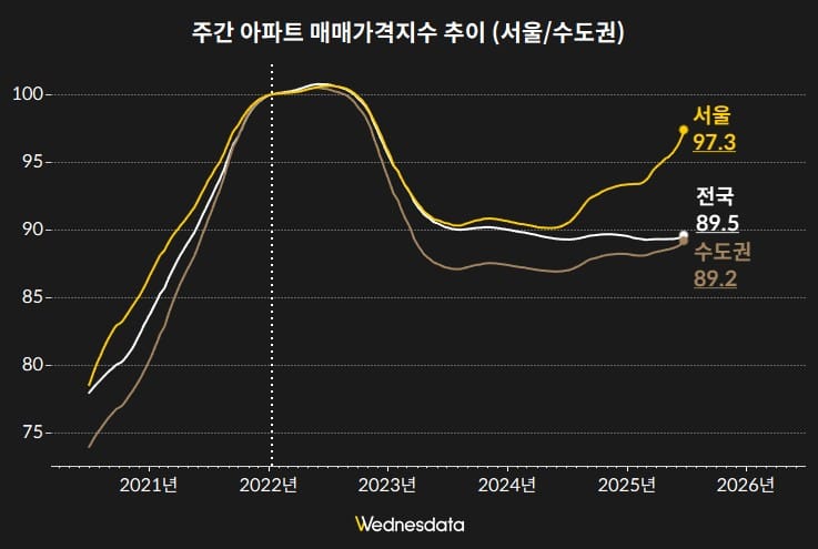 서울 아파트 매매가격지수는 97.3으로, 수도권(89.2)이나 전국 평균(89.5)보다 높은 수준을 보이고 있습니다. 이는 2023년 저점 이후 회복세가 서울에서 보다 뚜렷하게 나타나고 있음을 시사합니다.