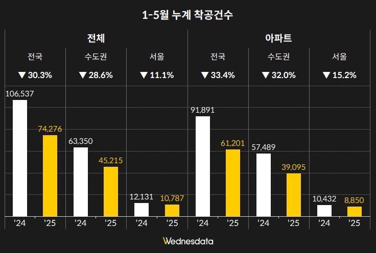 국토교통부가 6월 30일 발표한 ‘2025년 5월 주택통계’에 따르면, 올해 1-5월 누계 기준 전국 주택 착공 물량은 74,276호로 전년 동기 대비 30.3% 감소했습니다. 특히 수도권은 28.6% 감소, 서울도 11.1% 감소한 것으로 나타났습니다.