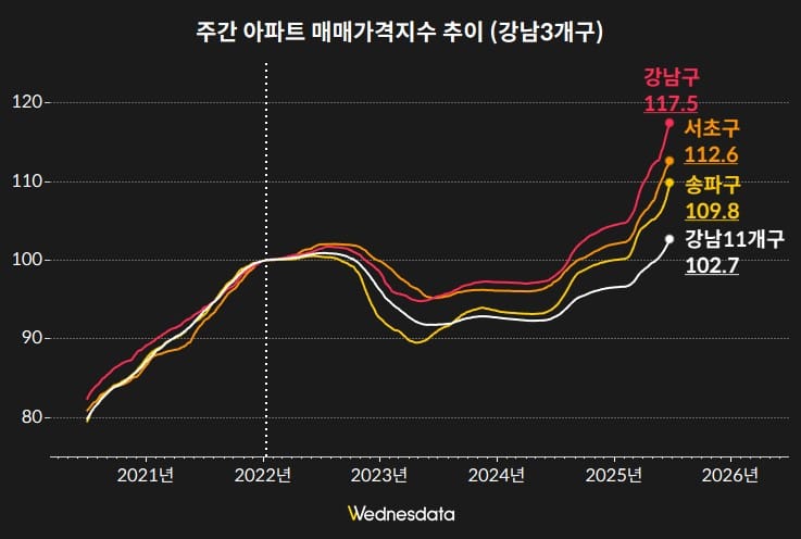 강남 11개구 중에서도 강남 3구(강남·서초·송파)는 상대적으로 더 빠른 상승 흐름을 보입니다. 이들 지역은 전고점 수준을 넘어서는 회복세를 보이며, 고가 신축 단지를 중심으로 실거래가가 상승 흐름을 이끌고 있습니다.