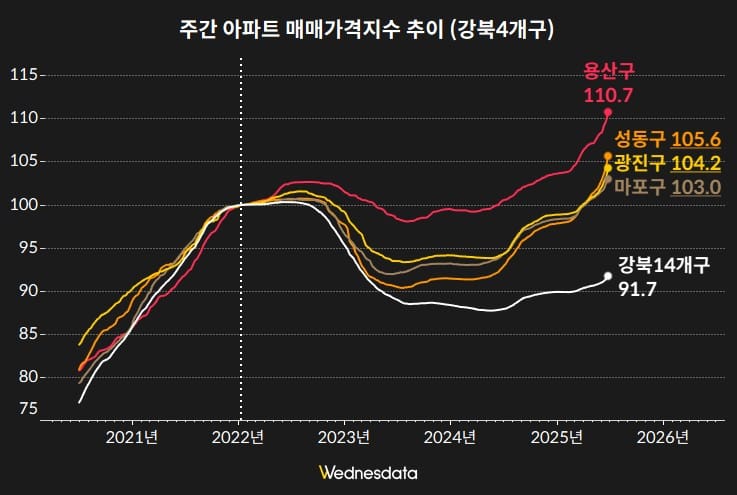 강북 지역에서도 회복세가 나타나고 있습니다. 특히 용산·성동·광진·마포구 등 일부 주요 지역은 전고점을 넘어선 지수를 기록하고 있습니다. 이들 지역은 교통망 개선, 도심 접근성, 개발 기대 등 복합 요인에 따라 강북권 내에서도 상대적으로 빠른 회복 흐름을 보이는 것으로 해석됩니다. 반면, 강북14개구 전체 평균은 여전히 91.7로, 같은 권역 내에서도 회복 양상이 지역별로 크게 엇갈리는 모습입니다.