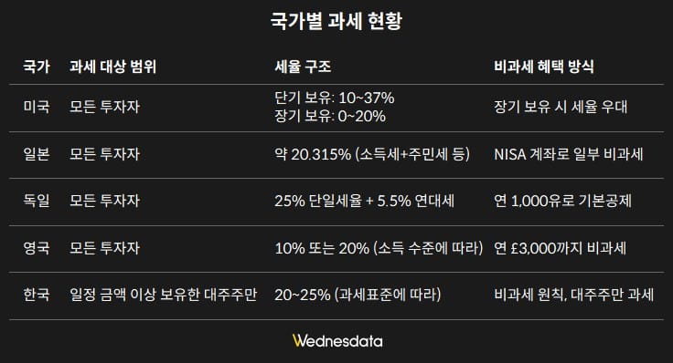 상장주식의 양도차익에 대해 세금을 부과하는 제도는 대부분의 나라에서 존재합니다. 미국, 일본, 독일, 영국 모두 투자금액과 무관하게 양도차익에 과세하고 있습니다. 다만 장기 보유자에게는 세율을 낮춰주거나, 소액 투자자에게는 일정 금액까지 비과세 혜택을 주는 방식으로 형평성을 보완합니다.