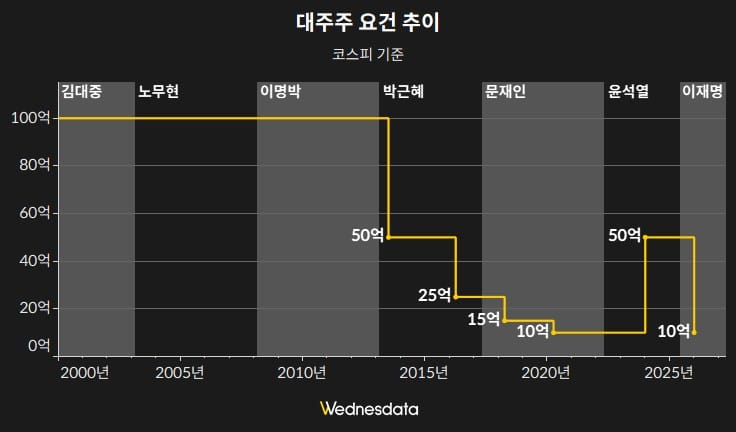- 김대중 정부: 대주주 양도차익 과세 제도 도입 (지분율 3% 또는 종목당 100억원 이상 보유)