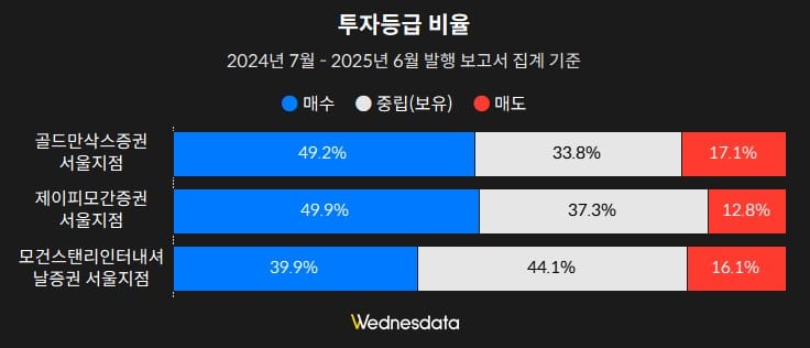 국내 리포트가 대부분 낙관적이라면, 외국계 증권사 리포트는 보다 솔직한 분포를 보여줍니다. 골드만삭스 서울지점은 매수 49.2%, 매도 17.1%, 모건스탠리와 제이피모간도 매도 비중이 10% 이상입니다.