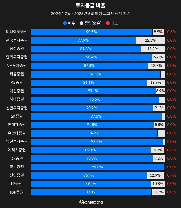 실제로도 그렇습니다. 2025년 7월 기준 브랜드평판 상위 20개 증권사의 최근 1년간 발행된 리포트를 분석해보면, ‘매수’ 등급이 평균 90.8%에 달합니다. 반면 ‘매도’ 등급은 가장 높은 곳조차 0.7%에 불과하며, 대부분의 증권사에서는 매도 의견이 한 건도 없는 수준입니다. 브랜드 신뢰도가 높을수록 의견이 더 다양할 것이라는 기대와는 정반대의 결과입니다.