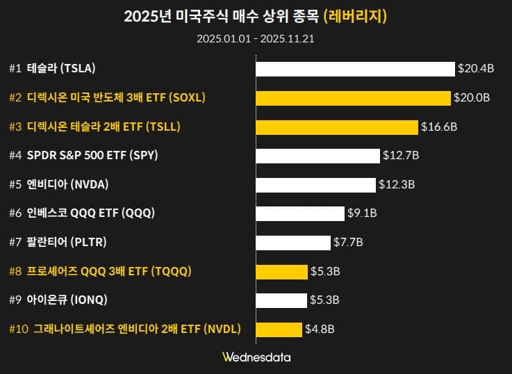 한국예탁결제원 자료를 살펴보면, 한국인(서학개미)이 가장 많이 매수한 미국 주식 상위 목록에는 테슬라, 엔비디아와 함께 늘 빠지지 않는 종목들이 있습니다. 바로 SOXL(반도체 지수 3배 추종)이나 TQQQ(나스닥 3배 추종) 같은 초고위험 ETF입니다.