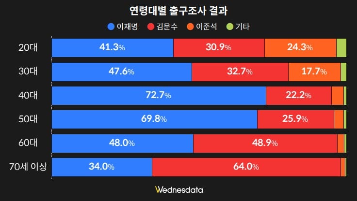 이번 출구조사 결과에서 20대 유권자의 24.3%, 30대 유권자의 17.7%가 이준석 개혁신당 후보를 선택한 것으로 나타났습니다. 세대 기준으로 보면, 이준석 후보는 2030 세대에서 상대적으로 가장 높은 지지를 받은 후보였습니다. 이는 40대 이상 연령층의 지지율이 5% 미만에 머문 것과 대조적입니다.