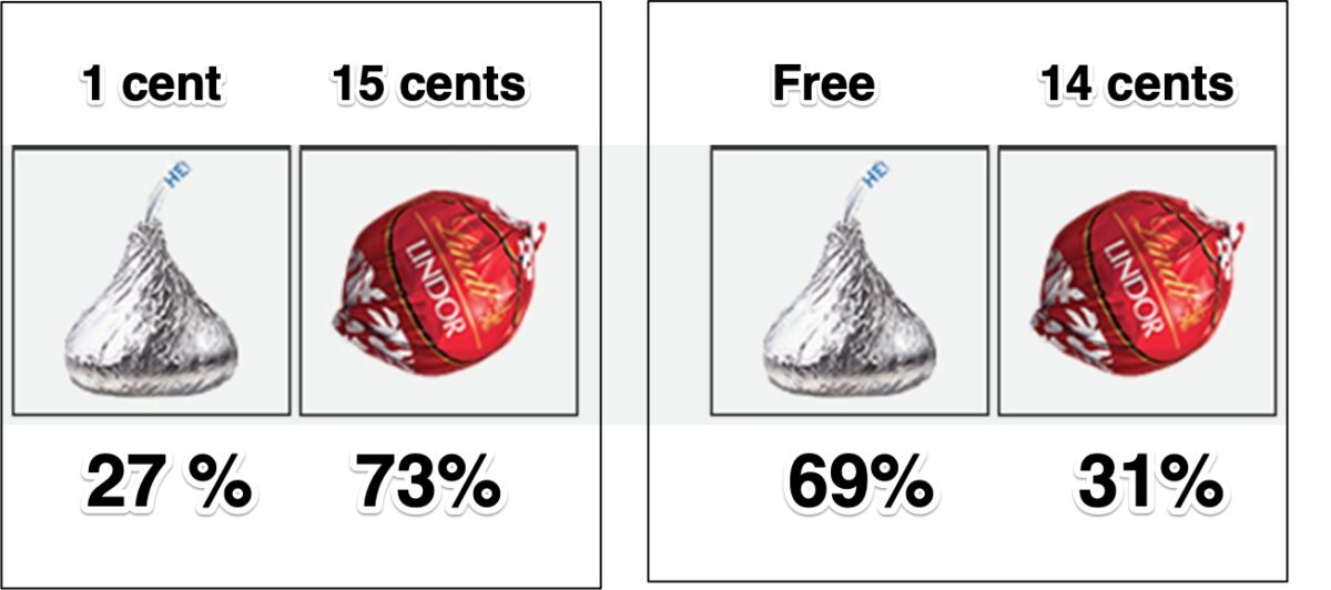 - 린트 초콜릿(14센트) vs 허쉬 키세스(0센트, 무료): 69%가 무료인 허쉬를 선택