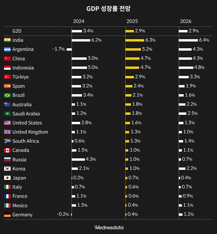 6월 3일 발표된 OECD 경제전망은 경제를 단기적인 등락이 아닌 구조적인 변화를 겪는 시스템으로 봐야 한다는 인식을 전면에 내세웁니다. 올해 성장률 전망치는 미국 1.6%, 중국 4.7%, 유로존 1.0%, 일본 0.7%로 낮은 수치를 예상하고 있지만, 중요한 건 그것이 ‘일시적인 하강’이 아니라 ‘장기화된 저성장’의 신호라는 점입니다.