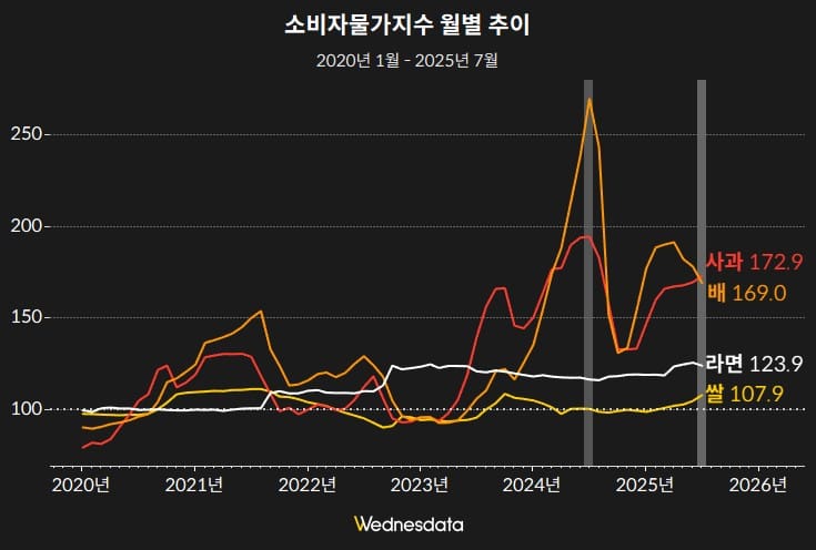 흥미로운 건, 뉴스의 단골손님이었던 사과(172.9)와 배(169.0)가 훨씬 높은 수준임에도 이번 달 주목을 받지 못했다는 점입니다. 이유는 단순합니다. 전년보다 가격이 떨어졌기 때문입니다.