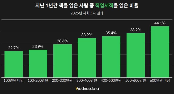 하지만 더 흥미로운 것은 그들이 '무슨 책을 읽는가'입니다. 소득 구간별 독서 선호 분야를 뜯어보면 의미심장한 차이가 발견됩니다. 소득이 높을수록 교양 서적뿐만 아니라 '직업 서적'을 읽는 비율이 유의미하게 높아지는 경향을 보였습니다.