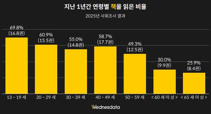 연령별 독서율을 살펴보면, 10대(13세~19세)의 독서율은 69.8%로 전 연령대 중 가장 높습니다. 20대 역시 60.9%로 과반을 넘깁니다. 반면 40대는 58.7%, 50대는 49.3%로 떨어지며, 60세 이상에 이르면 독서율은 30%까지 급락합니다. 독서량 또한 10대는 연간 16.8권인 반면, 60세 이상은 9.9권에 불과합니다.