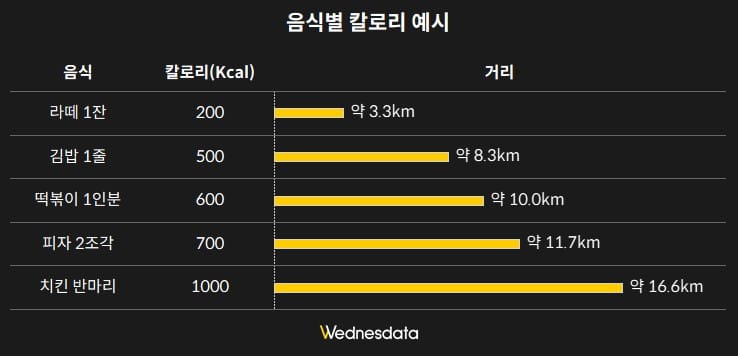 그 계산, 현실적으로 가능할까요? 체중 60kg 기준으로 우리가 흔히 먹는 음식들을 러닝 거리로 환산해보면 다음과 같습니다.