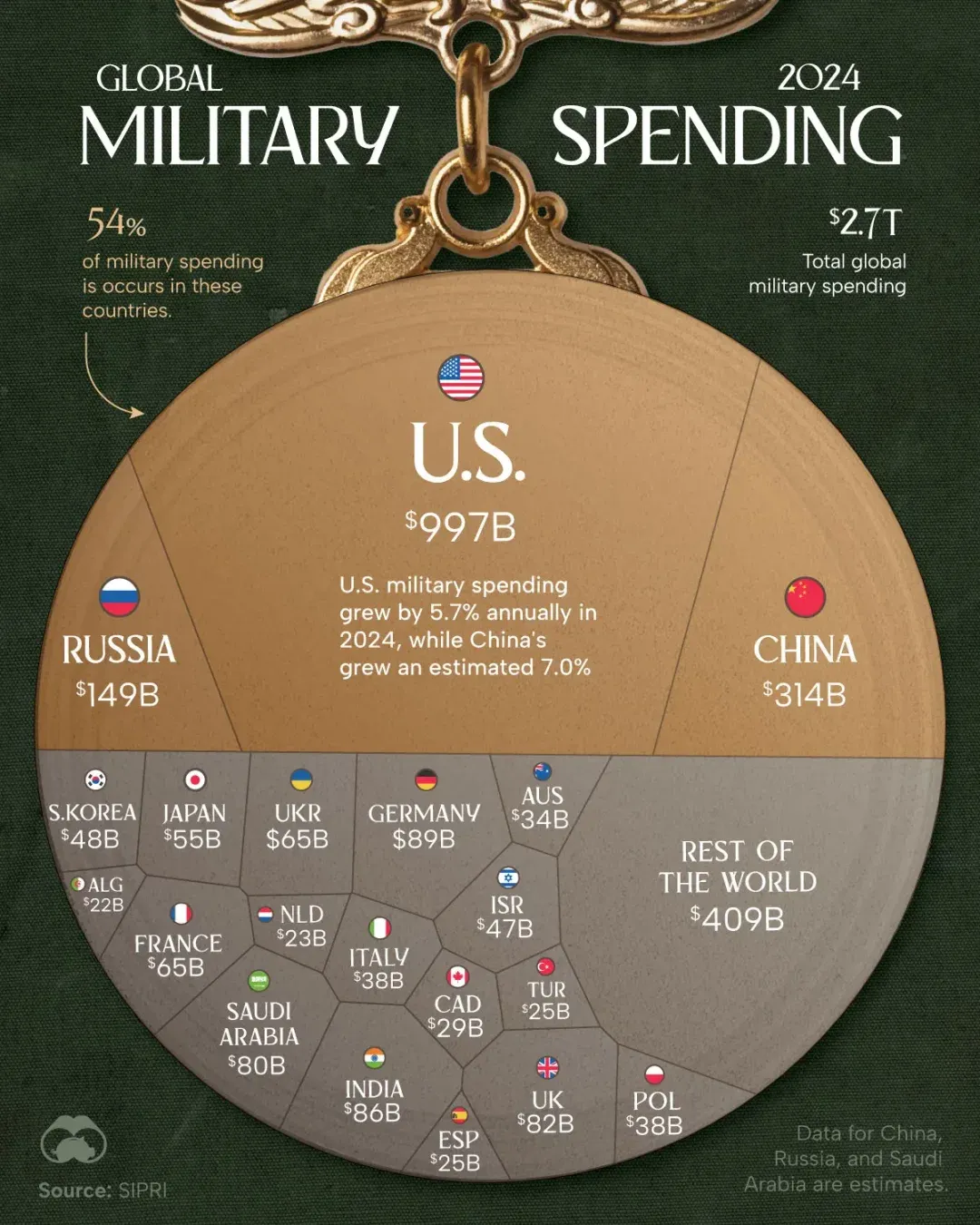 - 절대적인 우위: 중앙에 위치한 미국의 원은, 그 주변을 둘러싼 경쟁국인 중국과 러시아의 원을 합친 것보다도 훨씬 거대합니다.