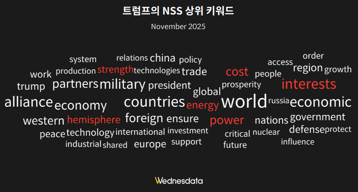 최근 트럼프 행정부가 2025년판 국가안보전략(NSS)를 발표했습니다. 전 세계 언론은 "미국이 변했다"며 떠들썩합니다. 하지만 웬즈데이터는 복잡한 외교적 수사 대신, 좀 더 직관적인 방법을 택했습니다.