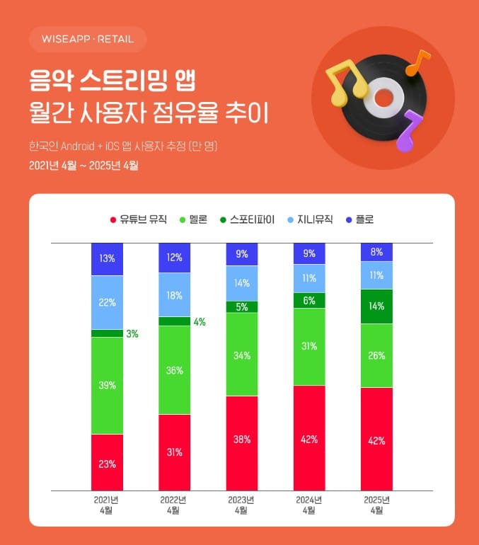 유튜브 뮤직은 2021년까지만 해도 점유율 23% 수준에 머물렀지만, 불과 2년 만에 시장의 판도를 뒤집었습니다. 2023년 4월에는 38%로 멜론을 앞질렀고, 2024년에는 42%로 단독 1위 자리를 굳혔습니다. 2025년 4월 기준 점유율은 42%, 2위인 멜론(26%)과의 격차는 16%p에 달합니다.
