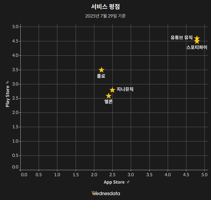 현재 멜론은 구글 플레이스토어에서 2.6점, 애플 앱스토어에서 2.4점의 낮은 평점을 기록하며 사용자 불만이 높아지고 있습니다. 기능 오류, 불편한 UI, 낮은 만족도에도 불구하고 여전히 시장 상위권을 유지하는 데에는 통신사 결합상품이라는 유통 구조가 큰 역할을 해왔습니다.